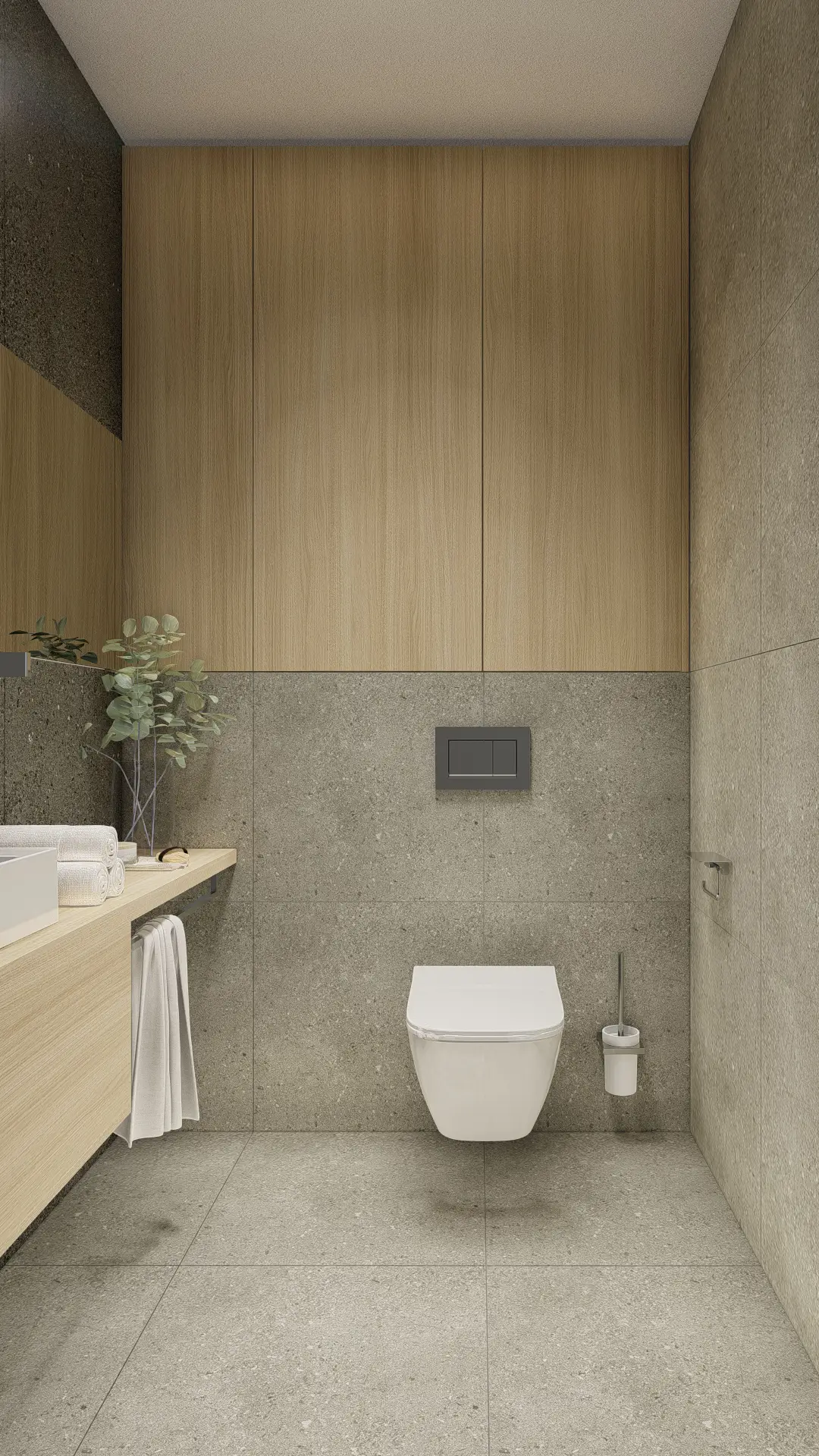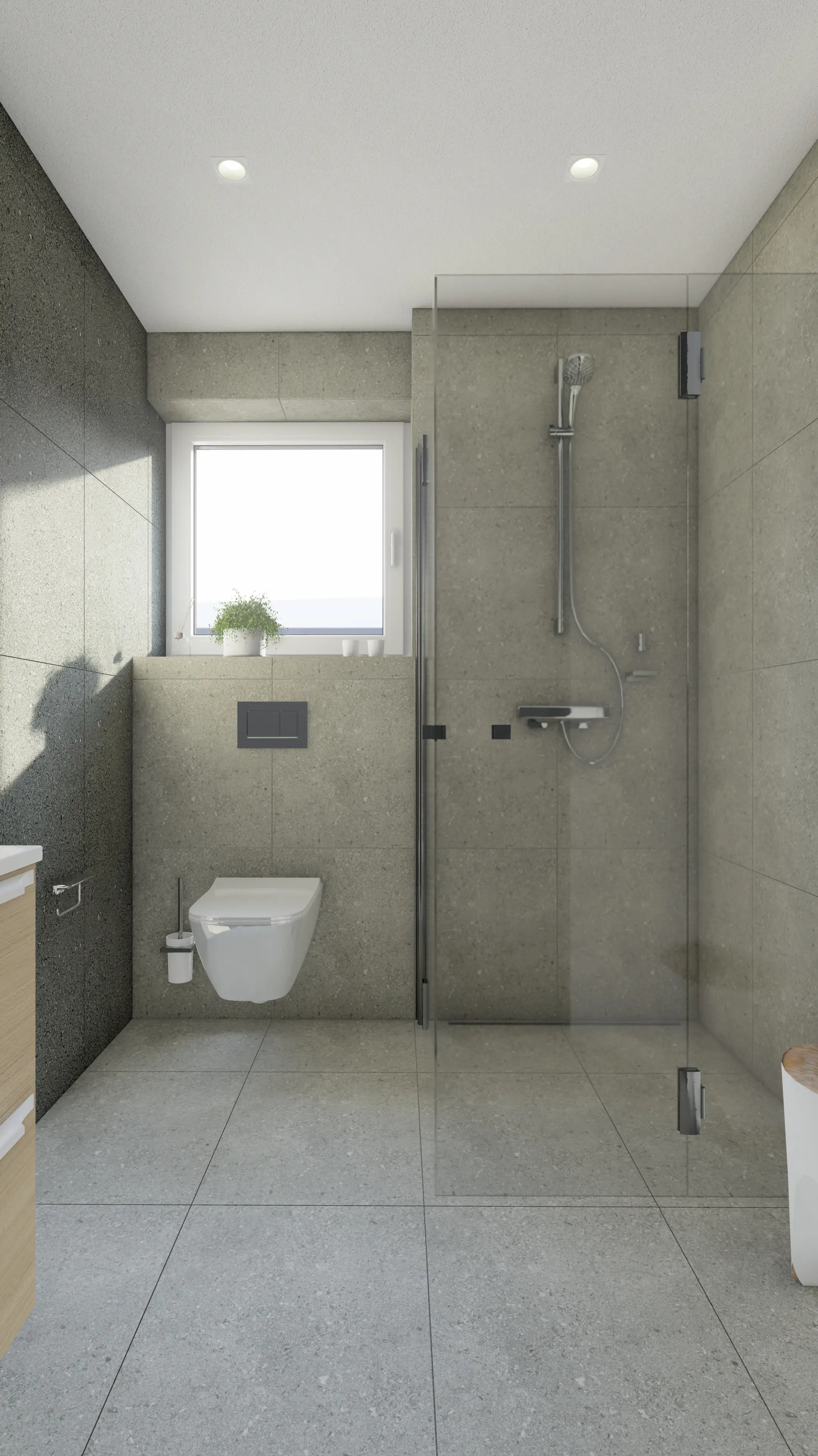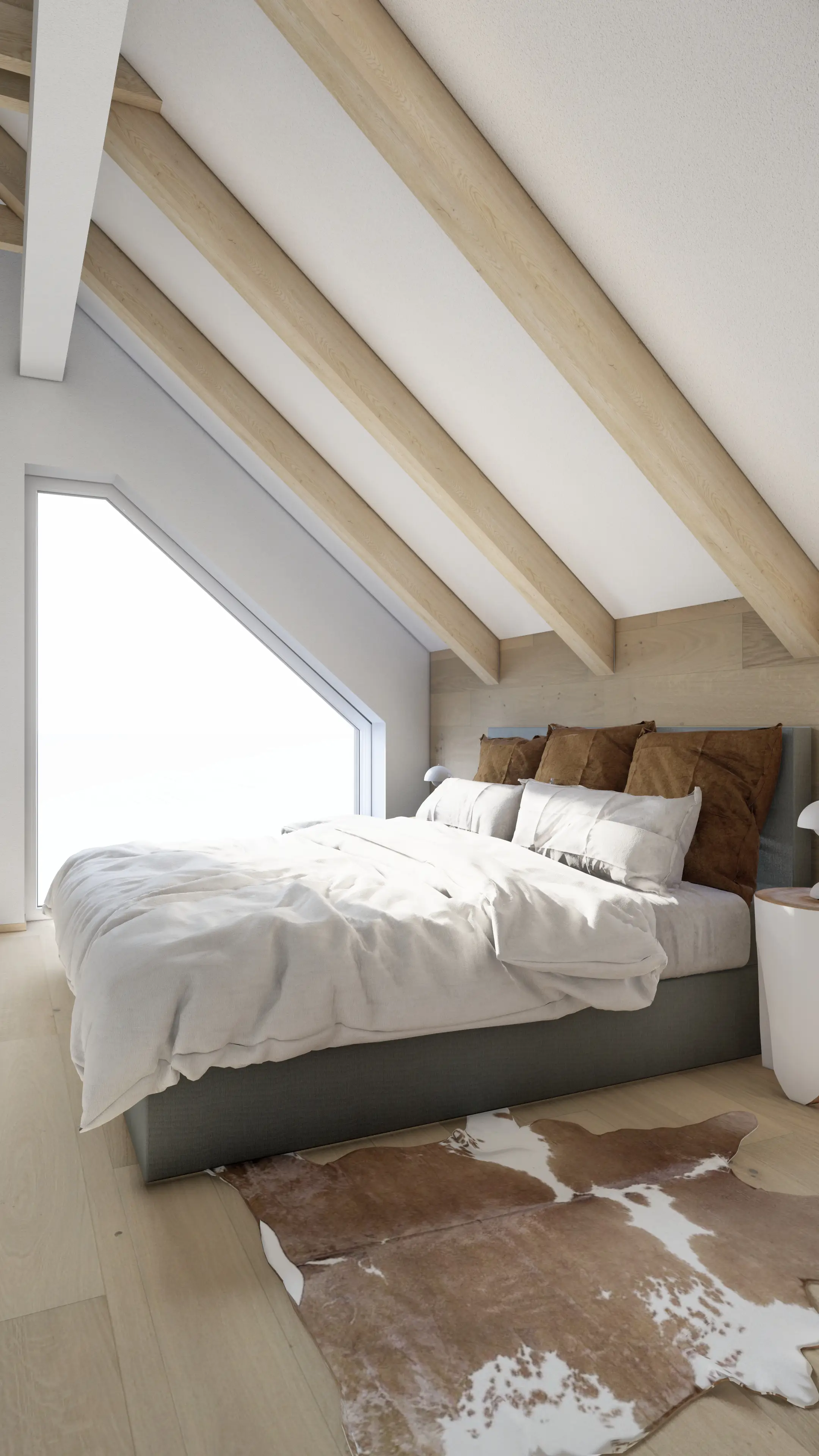 Na podlaze a v koupelnách pracujeme s texturou kamene v jemných šedých tónech. Tento materiál evokuje syrovost okolních skal a zároveň je maximálně praktický pro údržbu v horském provozu. V horních apartmánech hrají hlavní roli přiznané dřevěné krovy, které definují charakter podkroví.