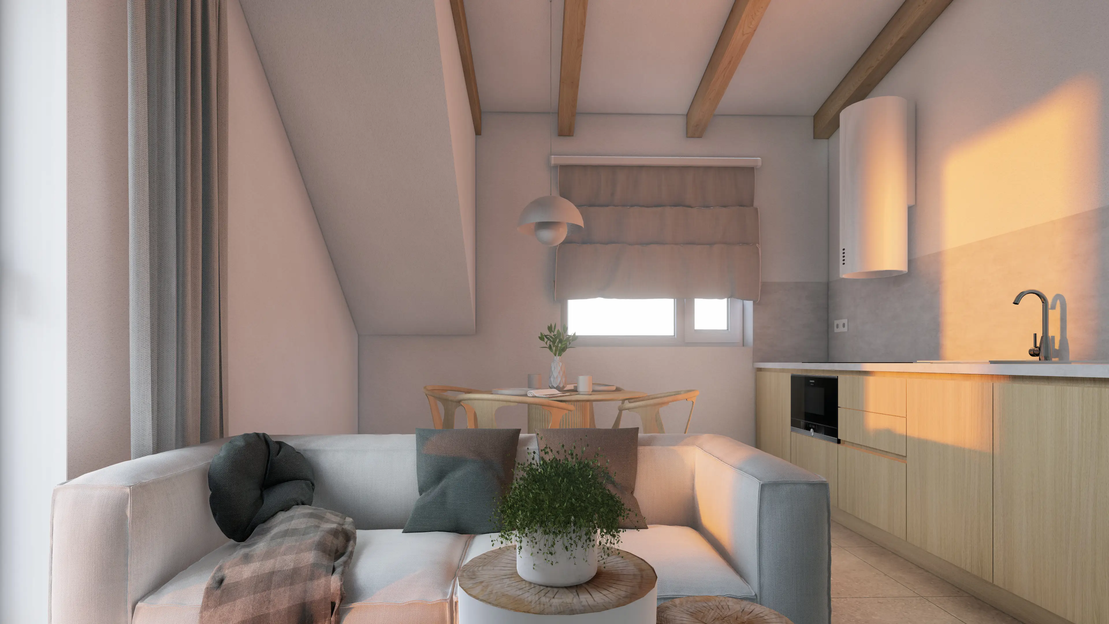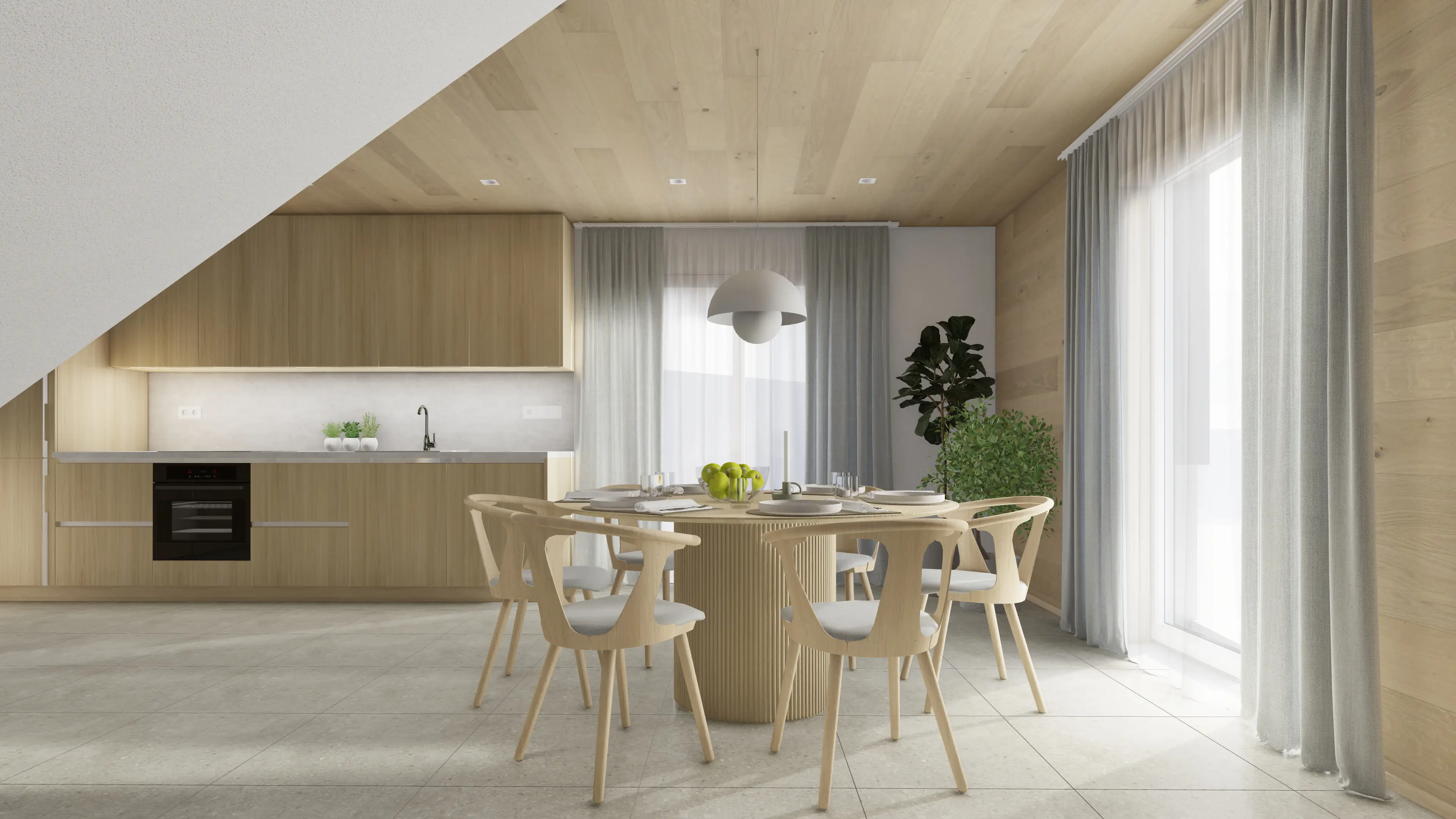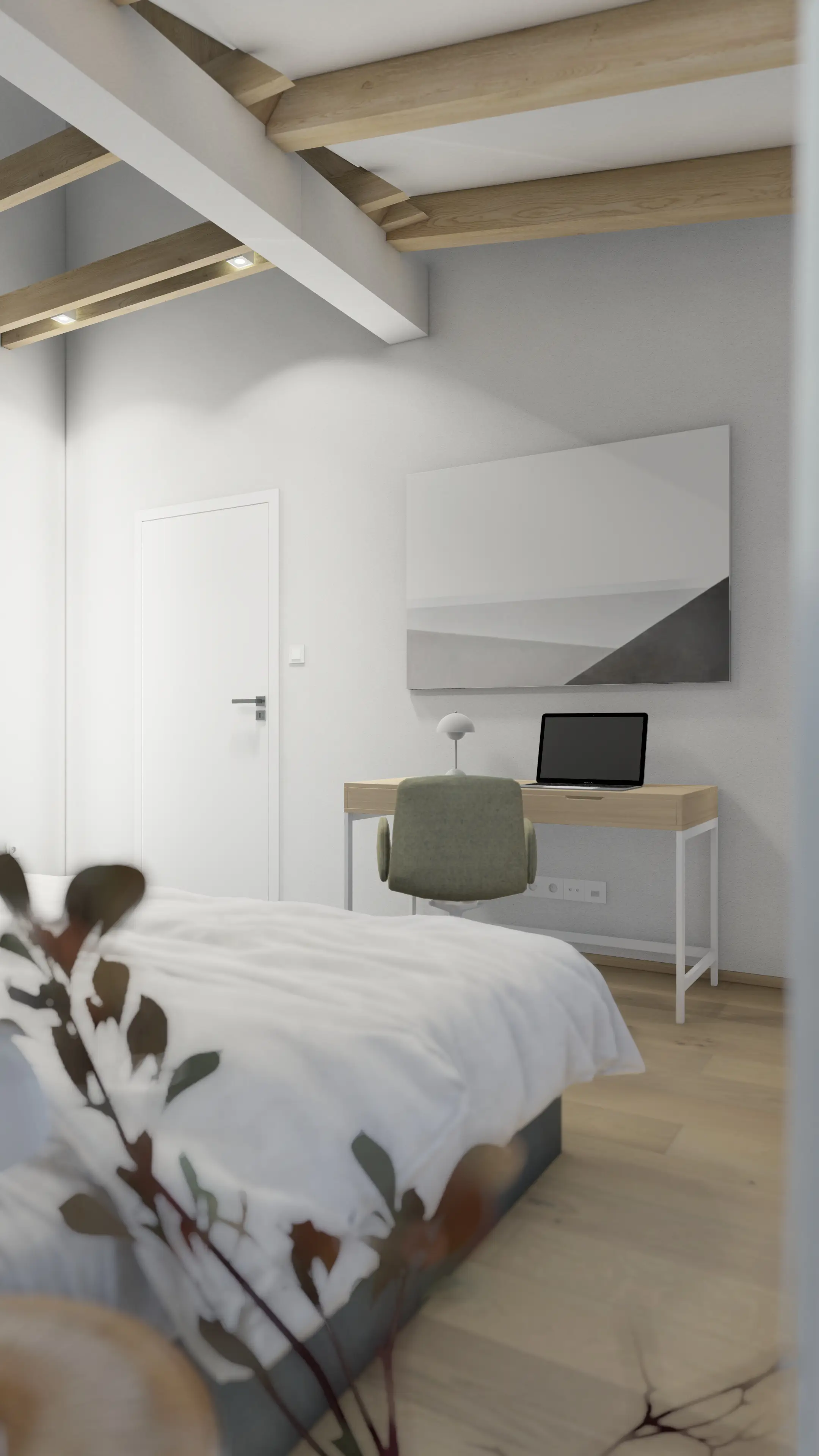 Návrh interiéru pro apartmány v Krkonoších sází na moderní pojetí horského bydlení, které kombinuje syrovost přírody s maximálním komfortem a teplem domova. Dominantním prvkem je přírodní dřevo, které se ze stropu a stěn plynule přelévá do nábytku a čisté bílé plochy nechávají vyniknout to nejdůležitější, a to výhledy do krajiny a klidnou atmosféru Krkonoš.
