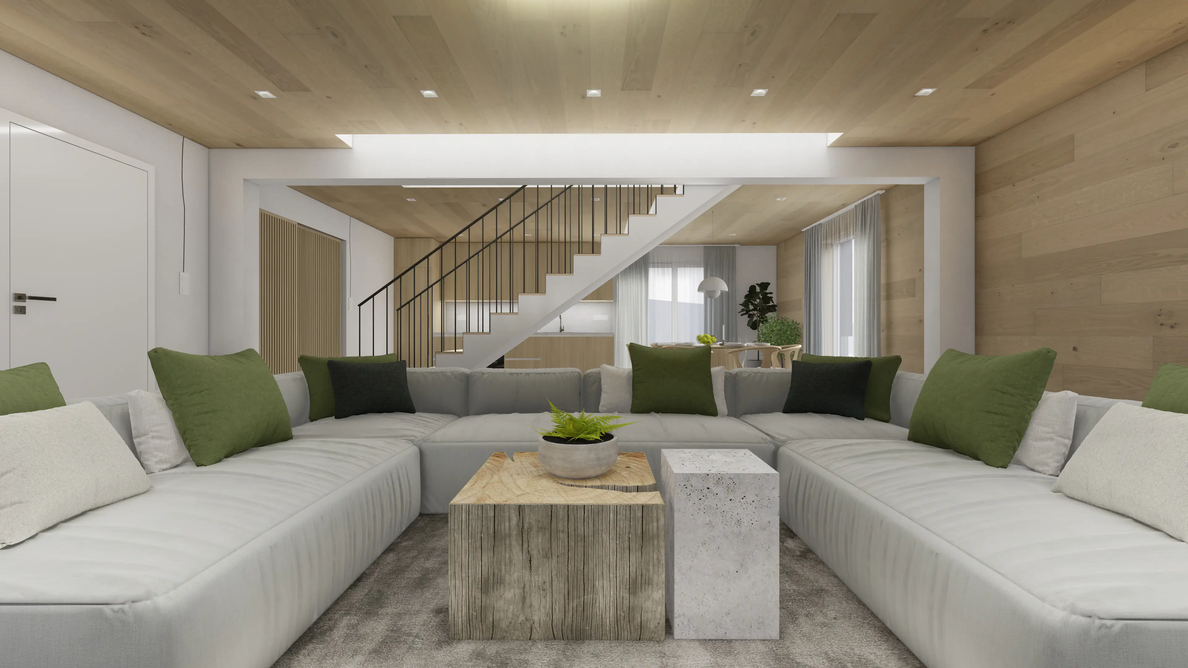 Obývací zóna je stvořena pro setkávání celé rodiny. Srdcem prostoru je velkorysá modulární pohovka v šedé barvě. Kulatý stůl v jídelně pak vybízí ke společným večerům u dobrého jídla.