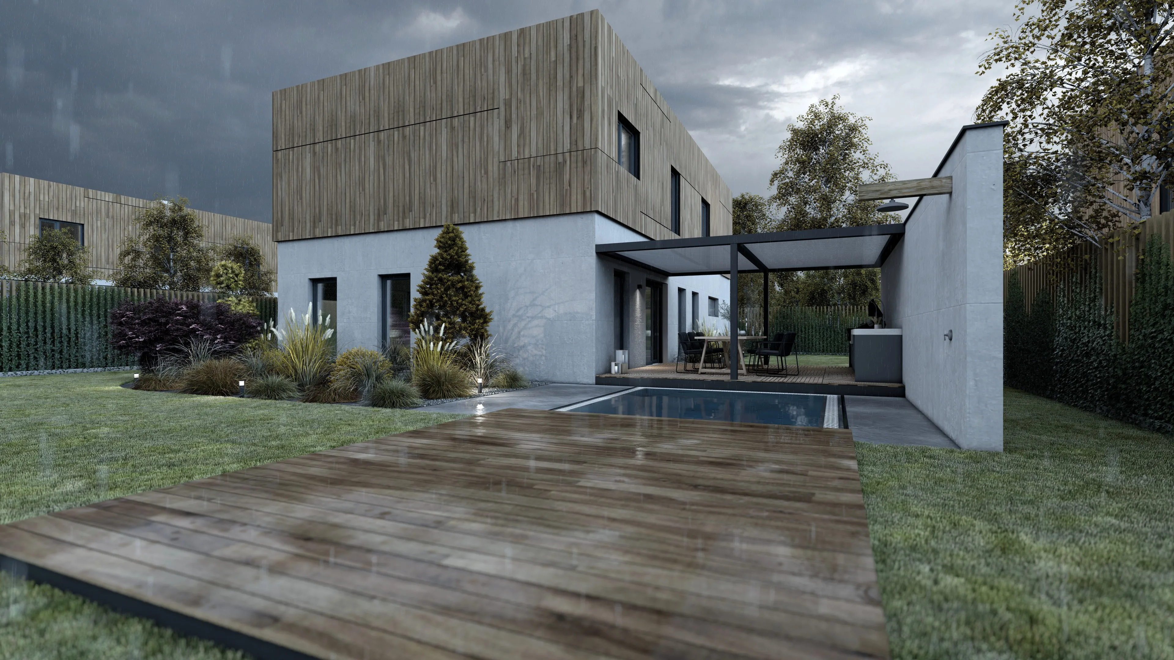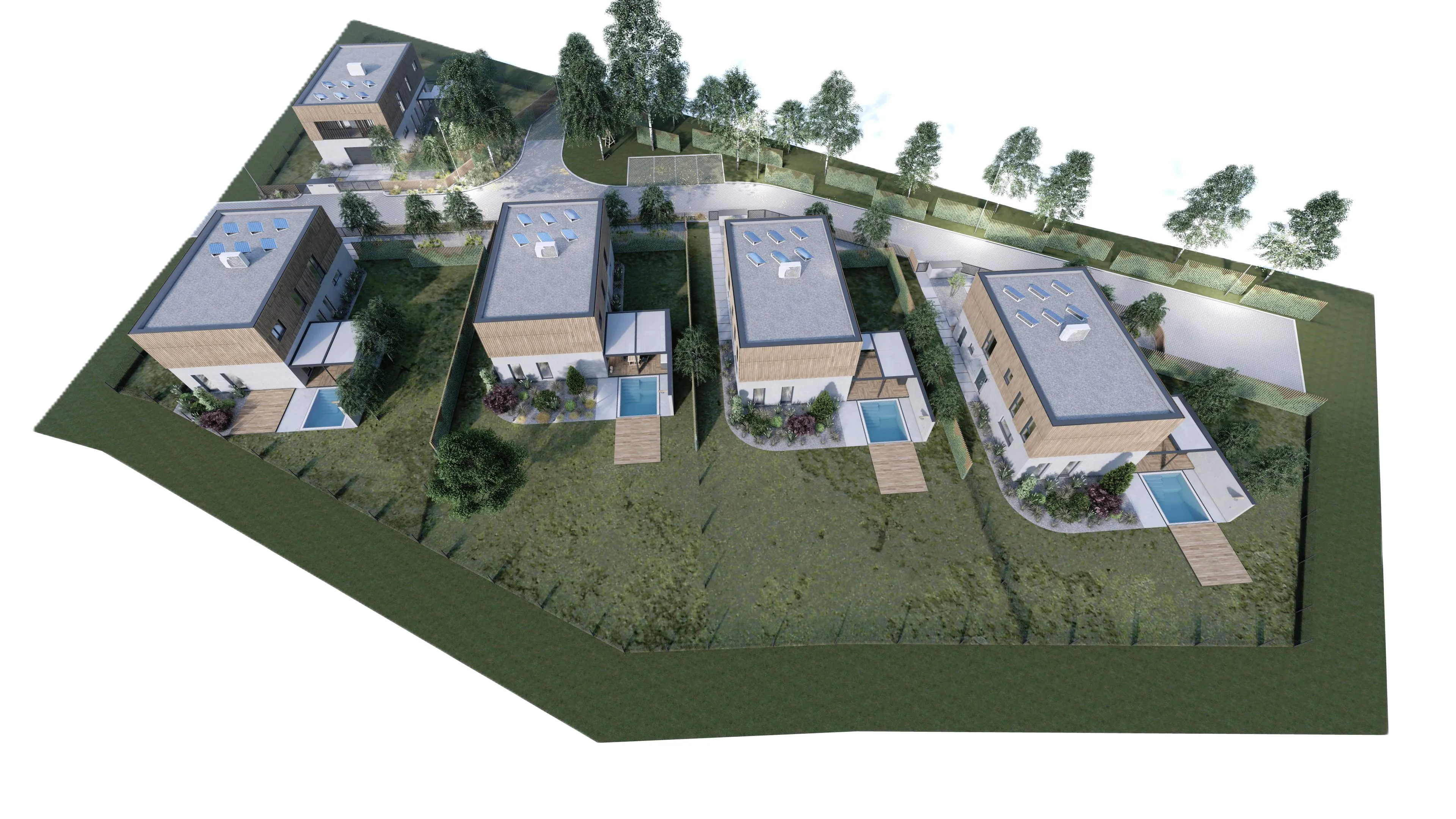 V malebné lokalitě nedaleko Berouna jsme navrhovali exkluzivní rezidenční projekt. Cílem bylo zachytit atmosféru nadstandardního bydlení, které citlivě vstupuje do okolní krajiny a nabízí budoucím obyvatelům maximální komfort. Tento obytný soubor se skládá z pěti samostatně stojících vil, které definuje minimalistický design a kombinace přírodních materiálů. Architektonické řešení sází na kontrast světlých omítek a dřevěného obkladu, což domům dodává hřejivý, a přesto moderní výraz.