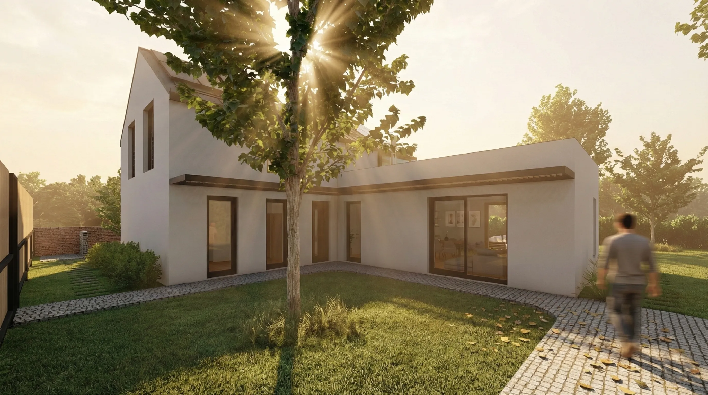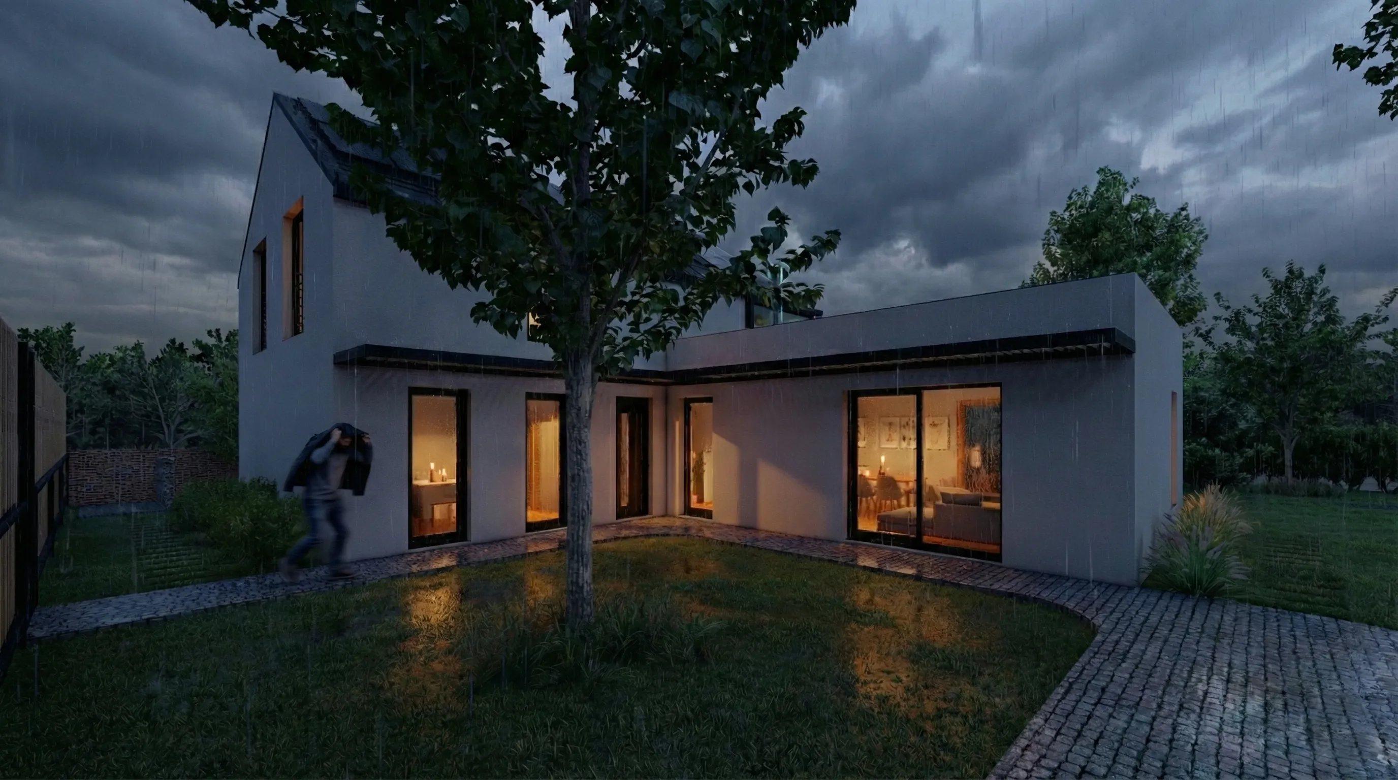 Investor nás oslovil se zadáním návrhu rodinného domu na parcele, kde stojí starší, dnešním standardům bydlení nevyhovující dům, který nebylo ekonomicky výhodné rekonstruovat. V návrhu se snažíme respektovat původní urbanistickou strukturu místa a hmota nového rodinného domu kopíruje umístění domu, určeného k demolici, přičemž průčelí domu se posouvá dále od místní komunikace a díky tomu budou místnosti v domě lépe chráněny od ruchu na přilehlé komunikaci.Hlavní hmota objektu je jednopodlažní s obytným podkrovím. Navazuje na ní přízemní hmota se zelenou střechou s extenzivním střešním pláštěm, ve které je umístěn hlavní obytný prostor domu – obývací pokoj s kuchyňským koutem. Zelené střecha bude poskytovat hlavnímu obytnému prostoru jako pasivní chlazení a díky tomu bude prostor i v horkém počasí příjemným místem. Tento prostor je propojen se zahradou díky velkým posuvným oknům, které umožní propojení se zahradou nejen pohledově, ale i fakticky. Rozmístění hmot vytváří v přední části pozemku dvůr, kterému dominuje strom – srdce domu. Hlavní hmota RD je částečně rozbita umístěním zimní zahrady s polykarbonátovým zastřešením, která je orientována na východ směrem k výhledům do údolí.