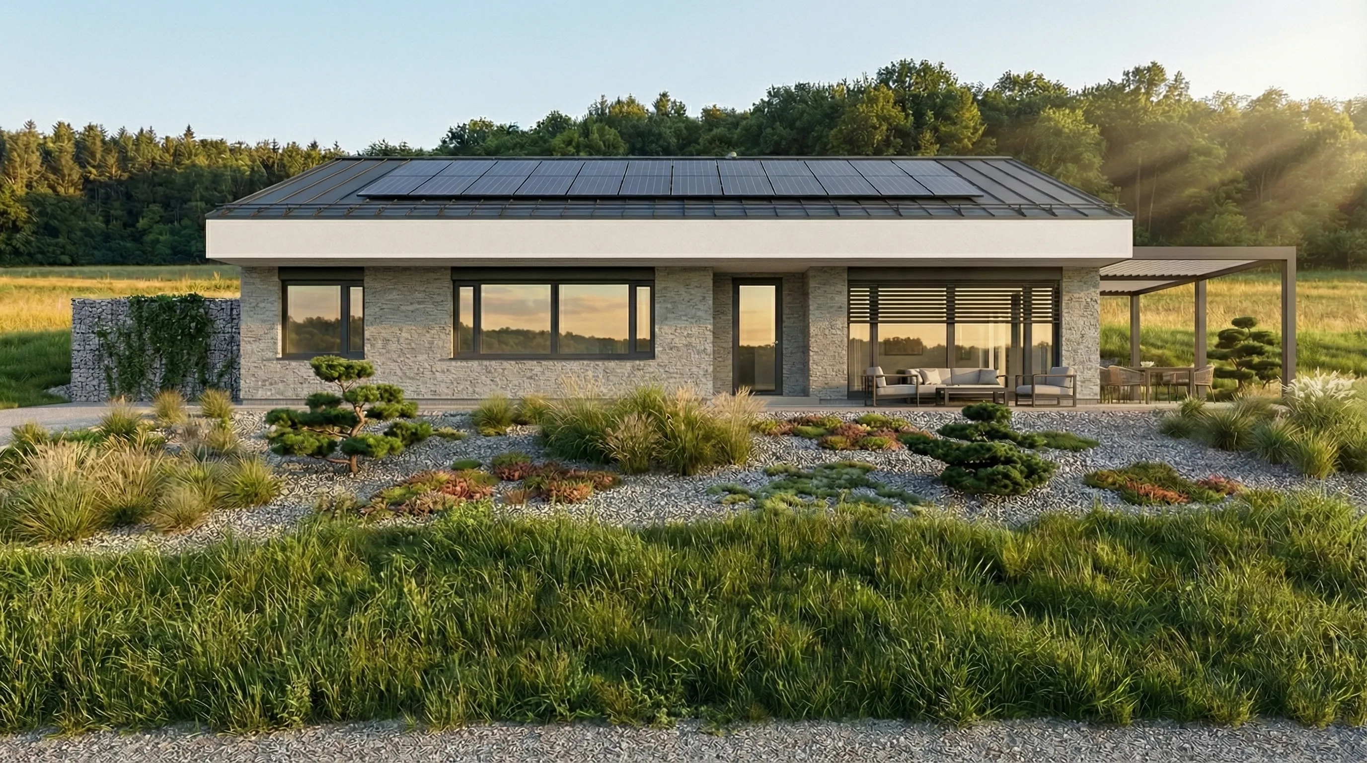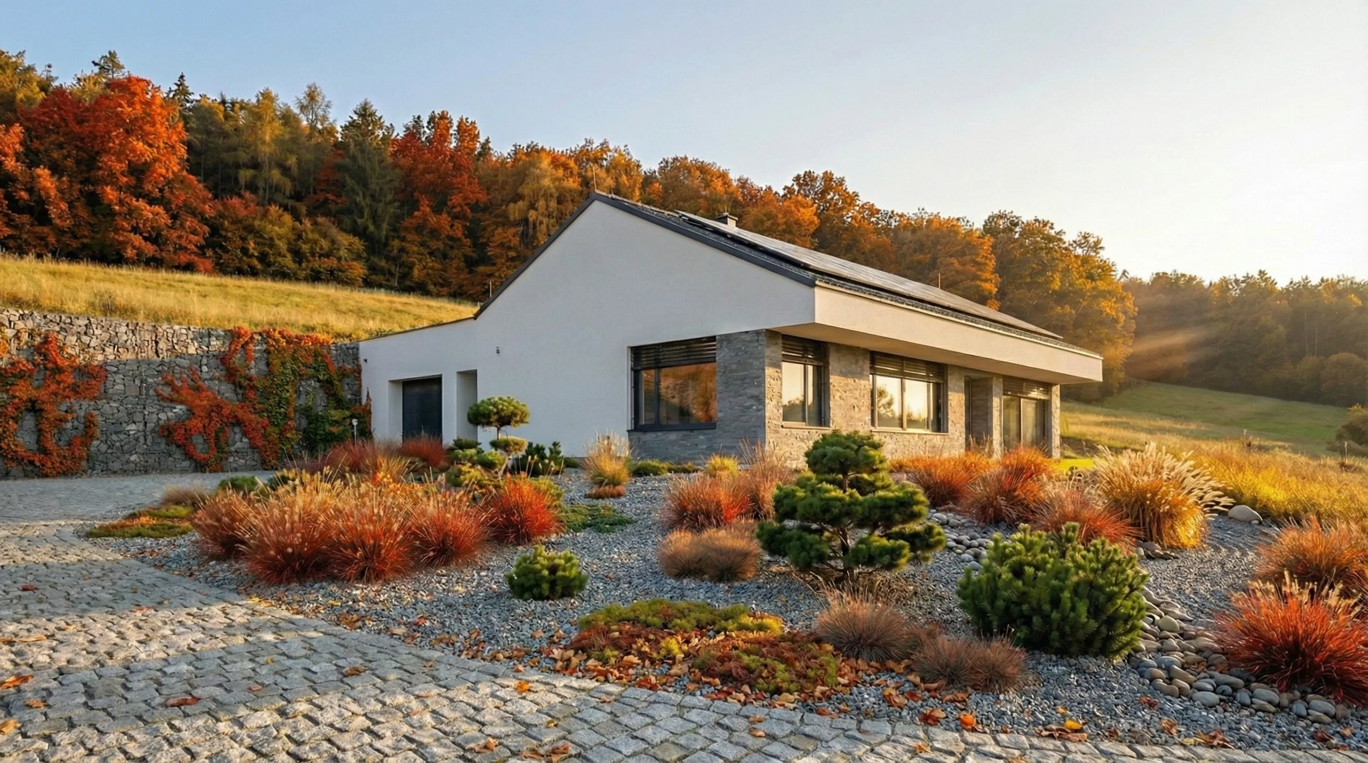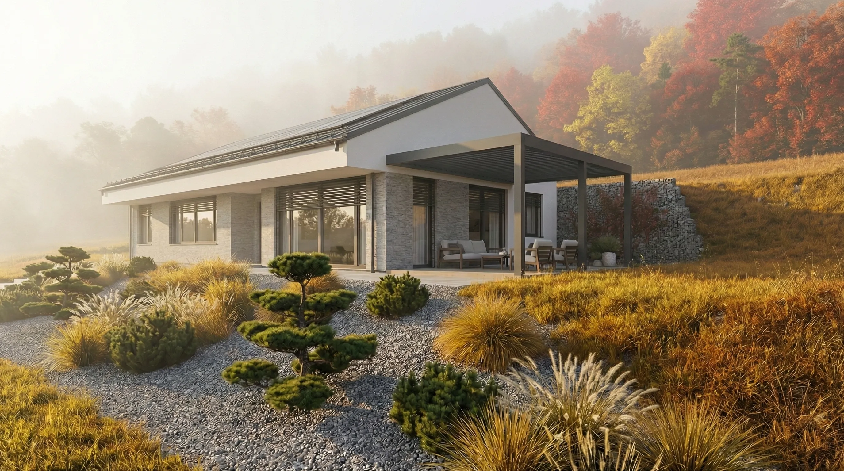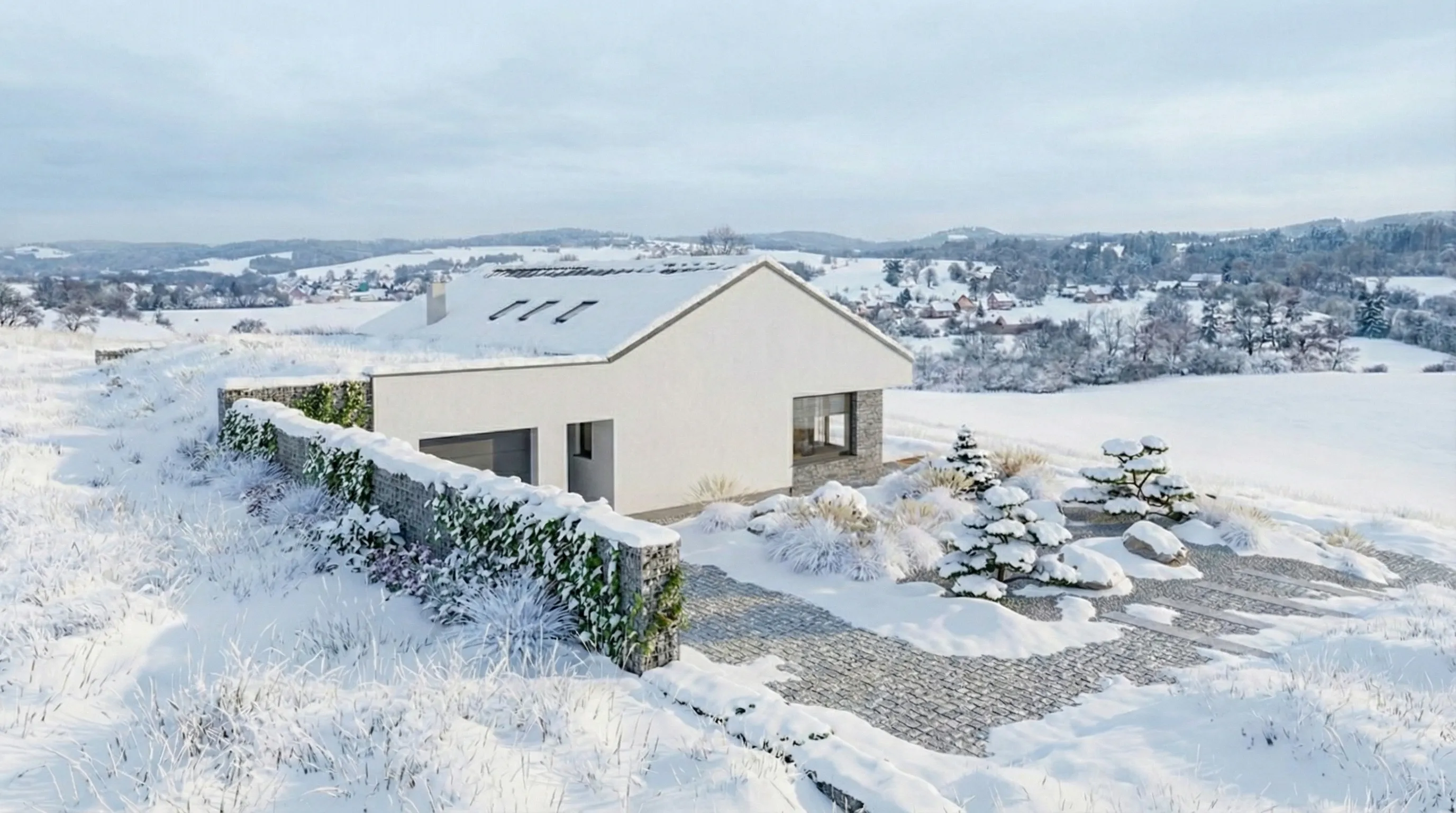 Elegantní přízemní dům, který sází na horizontalitu a propojení s terénem. Fasáda kombinuje čistou bílou omítku s výrazným kamenným obkladem, což stavbě dodává pocit stability a luxusu. Nízká sedlová střecha s falcovanou krytinou plynule navazuje na okolní svahy. Dům je obklopen precizně navrženou zahradou v japonském stylu, kde gabionové zdi tvoří funkční i estetický prvek vyrovnávající svažitý pozemek.