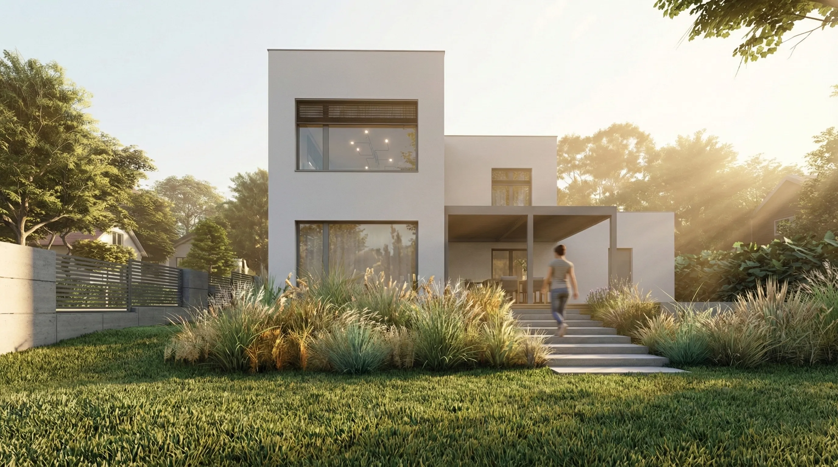 Hlavní hmota objektu je dvoupodlažní s plochou střechou. Navazuje na ní přízemní část, ve které je navržena garáž pro osobní automobil. Dům je částečně podsklepen. Návrhem vzniká uzavřená klidová zahrada se zastřešenou terasou, bazénem a prostorem pro relaxaci, zahradničení či další aktivity.